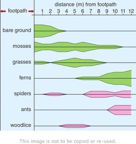 KITE DIAGRAMS- show changes over distance, particularly in vegetation, one axis is distance, the other the individual plant species, width of kite represents a single species, + width of kite enables visual comparisons to be made of the distribution of vegetation at any point in the section |
