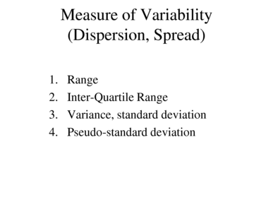 | MEASURES OF DISPERSION OR VARIABILITY- range= highest value- lowest value, inter-quartile range= Q3-Q1= [3(n+1)/4]-[(n+1)/4], Standard deviation= √[(∑x^2 )/n)-((∑x)/n)^2] | |