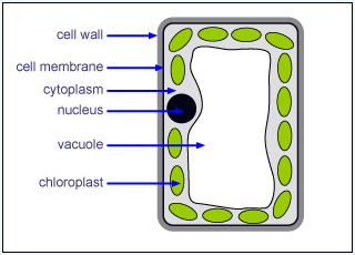 | What are the differences between a Plant cell and an Animal cell? (3) | There are 3 additional parts to a plant cell, which are not found in an animal cell. - a vacuole - a cell wall - chloroplasts |