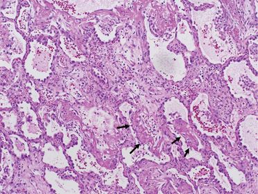 | QUAL A MICROSCOPIA DA PNEUMONIA INTERSTICIAL? | INFILTRADO INFLAMATÓRIO, ESPESSAMENTO DOS SEPTOS INTERALVEOLARES, MEMBRANA HIALINA |