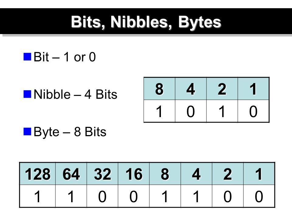 | Why computers use binary | RAM uses charged or uncharged capacitors to show it 0 - Absent or off 1- Present or on |