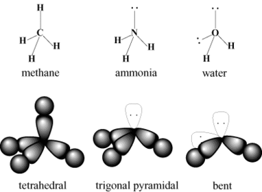 | If the central atom is surrounded by four negative regions/electron clouds, the electrons involved repel each other to a ... | tetrahedral arrangement |