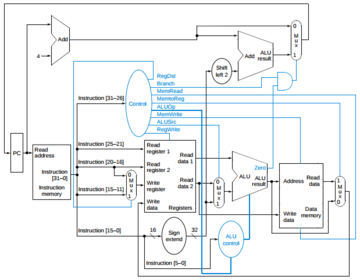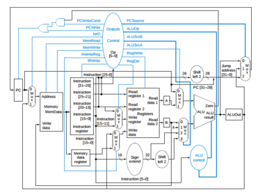 | Porque a implementação com um único ciclo é ineficiente? | Usando apenas um ciclo, o ciclo deve ser longo o suficiente para acomodar a instrução mais longa (load). Além disso, com um único ciclo, não pode haver nenhum recurso que seja usado mais de uma vez por instrução (para evitar incoerências), por isso, todos os componentes que precisam ser usados novamente devem ser duplicados (como ter que criar uma memória para instrução e uma para dados). |