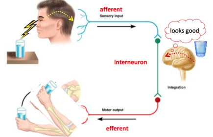 | Reflex arc summary | • Sensory receptor – reacts to stimulus • Sensory neuron – carries message to integration centre • Integration centre – processes information and direct motor output (Interneuron and/or synapse) • Motor nerve – carries message to an effector • Effector organ – is the muscle or gland to be stimulated |