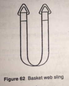 | What does a basket web sling look like and what is it used for? | It has metal triangles of equal size at each end of the webbing |