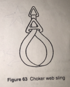 | What does a choker web sling look like and what is it used for? | It has a larger triangle containing a slot at one end and a smaller triangle at the other end |