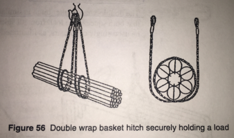 | what is a double basket hitch? Why is it used? | Loads that require support from underneath are lifted with two basket hitches. |
