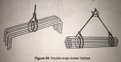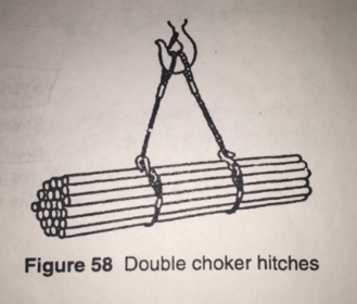 | What is a double choker hitch? | Two single chokers used to lift a load that require level lifting |