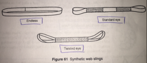 | What are the differences between the endless, standard eye, and twisted eye synthetic web slings? | Endless: a sling connected to itself, forming a loop. Standard eye: A sling with a loop at each end. Twisted eye: A sling with a loop at each end that is twisted. |