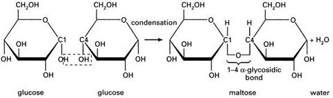 | Give an example of two disaccharides bonded with a glycosidic bond. | 2 glucose molecules combine to form a molecule of maltose. The bond is formed between groups attached to carbon 1 on one molecule and carbon 4 on the other molecule of α-glucose and so it is referred to as a α 1,4 glycosidic bond. |