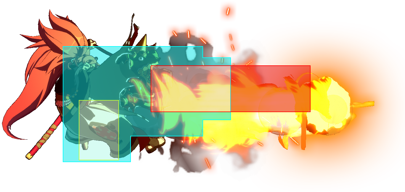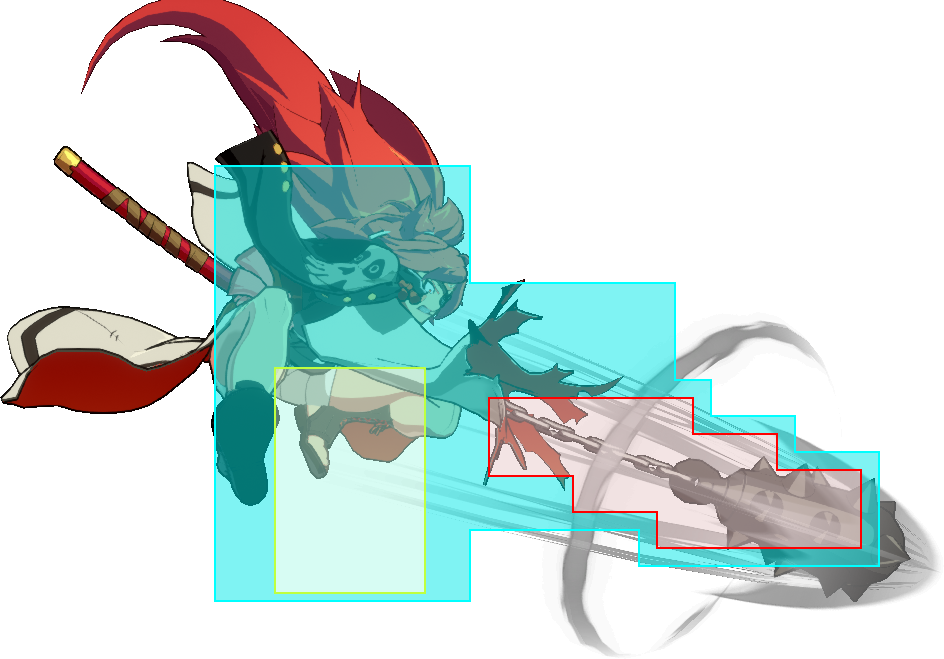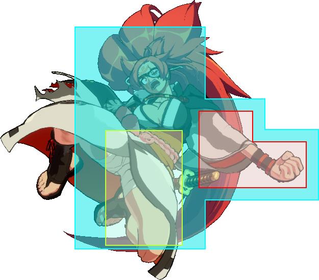 | Baiken 5H Guard: All Startup: 13 Active: 2 Recovery: 25 On-Block: -8 | |