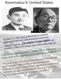 | Korematsu v. Inited States (1944) | During WWII Japanese American citizens living on the West Coast were moved to internment camps. Supreme Court upheld the President's authority to do this. This case is an example of the President's power to issue an executive order, checks and balances, and judicial review |