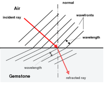 | Refractive index | the ratio of the velocity of light in the two medias, found by using Snell's law. if the refractive index is large then the light is refracted by a large angle |