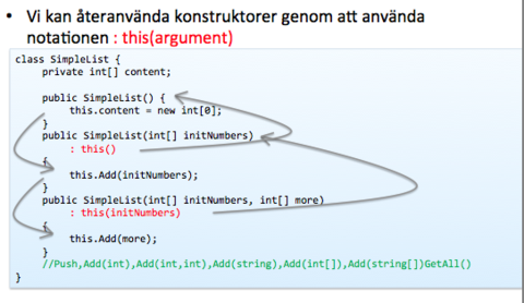 | överlagrade konstruktorer | när man skapar flera olika konstruktorer som tar olika argument. Det går att återanvända konstruktorer geom att använda : this() |