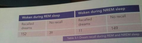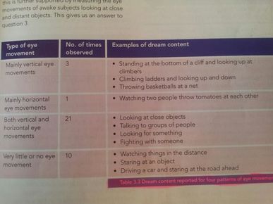 | 1. People are more likely to report dreams if they are woken during periods of REM than NREM. 2. People can estimate the duration of dreaming to an extent. | 3. The direction of eye movement during REM seems to be related to dream content. There are no real conclusions only that REM sleep IS connected to dreaming. |