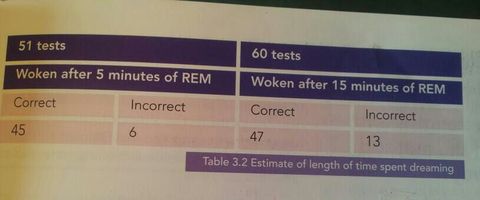 Subjects were woken after either 5/15 mins of REM and asked if they had been dreaming for 5 or 15 mins. Results show that pp's were mostly accurate in their estimations. |