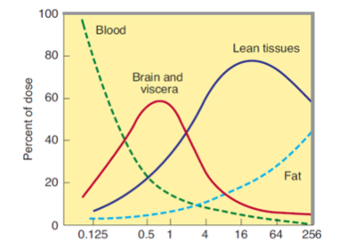 | Explain these graphs | 1) Blood plasma levels rapidly decrease due to absorption of drug by tissues 2) Brain and viscera levels rapidly rise and decrease due to being well vascularised 3)Levels in lean tissue stay high 4) Drug stored in fat |