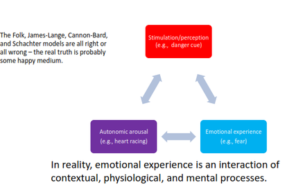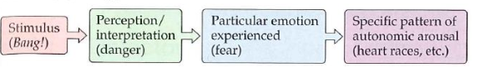 | James-Lange theory | physical autonomic arousal (heart races) --> particular emotion experienced |