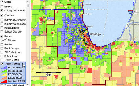 | What is the map above. Where would you expect to see growth from 2000-2010? | This is the Chicago metropolitan area. You would expect to see growth in the area surrounding the city, not so much in the urban area (the city itself) or the rural areas outside the metropolitan. |