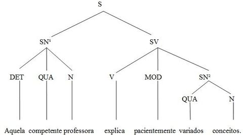 | Sintagma Verbal (toma-se como exemplo a sentença anterior) | O Sintagma Verbal (SV) compõe o predicado: “explica pacientemente variados conceitos.” O núcleo do predicado é o verbo (V) significativo “explica”, cuja ideia é modificada (MOD) pelo advérbio de modo “pacientemente”. Cabe frisar que o sintagma verbal pode ter o significado complementado por sintagma nominal: “variados conceitos”. |