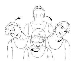 | Neck Roll | 1. Sitting up, drop head to chest. 2. Very slowly, take 4 seconds to tilt head up, looking at the wall, eyes are open. 3. With eyes open, tilt back the other way taking 4 seconds. 4. Now, with eyes closed, repeat the tilting. 5. Repeat eyes open, eyes closed for 3 seconds. MAY HELP WITH: * Motion Sickness * Balance and Coordination |