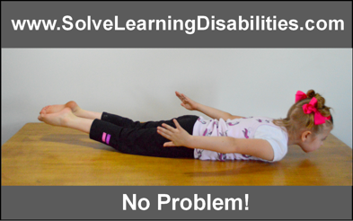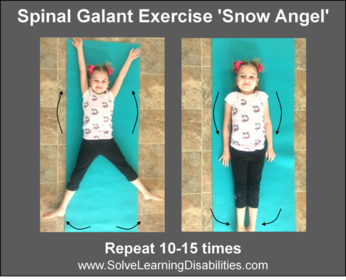 | 1. Lie on back with legs closed and hands at the side 2. Very slowly do the movements of a snow angel, by bringing the arms up and opening the legs as wide as possible. Arms stay on the floor as much as possible. 3. For 30 seconds, close the legs and bring the arms to the starting position 4. Every 15 seconds, take a second to readjust the arms and legs. This is a difficult exercise because the arms move over twice as fast as the legs. 5. Repeat 2 more times. MAY HELP WITH: * Bladder Control * Poor Concentration * Poor Short-Term Memory * Sensory Integration Problems * Auditory Processing Difficulties * Near Focusing Problems Difficulty with Reading | |
