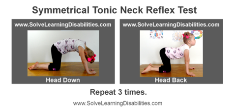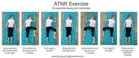 | Fly to the Moon Exercise (to Integrate the Tonic Labyrinthine Reflex) | 1. Lie on stomach 2. Lift chest off the floor, leaning on one elbow, other arm up. 3. Move one hand slowly to the side, then slowly stretch it away. The entire time, watch the fingers 4. Slowly bring thumb back to the nose, then repeat again for 30 seconds total 5. Repeat on other side 6. Rest with chest down or in child's pose (Yoga position) if back becomes tired 7. Repeat steps 1-5 two more times MAY HELP WITH: * Poor Posture * Weak Muscle Tone * Visual Problems with refocusing near to far and far to near * Spatial problems (bumping into things) * Poor sequencing and organization skills * Poor sense of time |