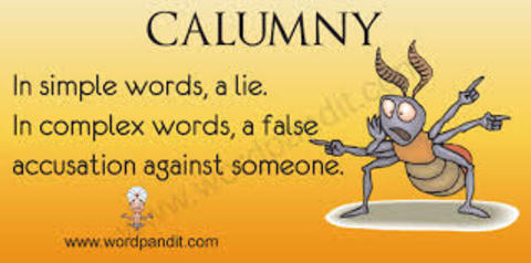 | calumny | The calumny against the bishop forced him to resign from the church. |