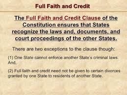 | Full Faith and Credit Clause | States must recognize the public acts, records and judicial proceedings of every other state. (article 4) |