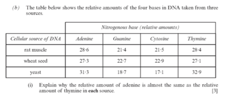| ii) a sample of DNA was analysed, 23% of the nucleotides contained guanine. Calculate the percentage of nucleotides which contained adenine. Show your working. | 23% guanine so 23% cytosine. 100 - 46 = 54% made up of thymine and adenine. Adenine = 54/2 = 27% |