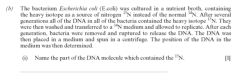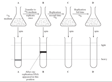 | iii) These are the results. Explain why tubes A and B support semiconservative replication. | Tube A is all heavy N15. Tube B DNA is a mixture of heavy and light (N15 and N14) so in a intermediate position. DNA in tube B must therefore be made from one strand of heavy and one strand of light. If it was conservative replication there would be two bands in the light and heavy position. |