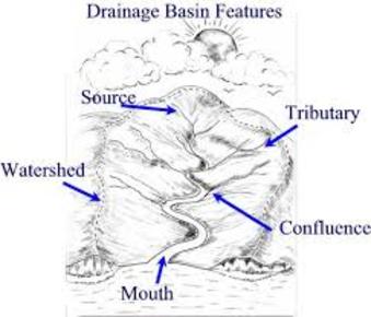 | features of a drainage basin | tributary: smaller river joins main river source: where river starts in upland area e.g mountains confluence: point where two rivers join mouth: river flows into sea or lake |