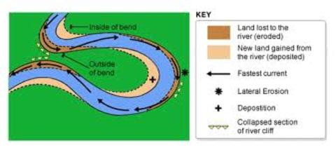 | deposition | when a river drops eroded material - happens when a river loses velocity (slows down) |