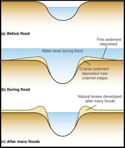 | flood plain | the wide valley floor on either side of a river which occasionally gets flooded |