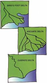 | deltas: low lying areas where a river meets the sea or a lake | rivers slow down when they meet the sea/lake and deposit material - it builds up, the channel is blocked and splits up into smaller rivers: distributaries |