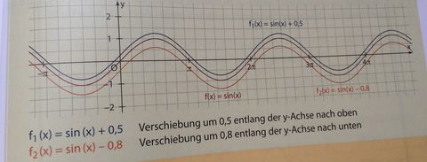 | Parameter d bei a*sin(b*x+c)+d | bewirkt eine Verschiebung des Graphen entlang der y-Achse f(x)=sin(x)+0,5 ... Verschiebung um 0,5 entlang der y-Achse nach oben f(x)=sind(x)-0,8 ... Verschiebung um 0,8 entlang der y-Achse nach unten |