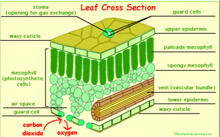 | epidermis | -layer of cells on the upper and lower surfaces of the leaf -clear layer of cells to allow light in |