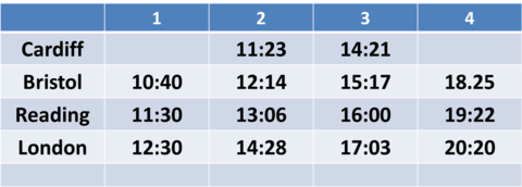 | Turn the card for questions | IF I ARRIVED IN READING AT 13.06, WHICH TRAIN AND AT WHAT TIME DID I LEAVE CARDIFF? I ARRIVED IN LONDON AT 12.30 AFTER DEPARTING FROM CARDIFF 2 HR 33 MINS BEFORE. WHAT TIME DID I LEAVE CARDIFF? |
