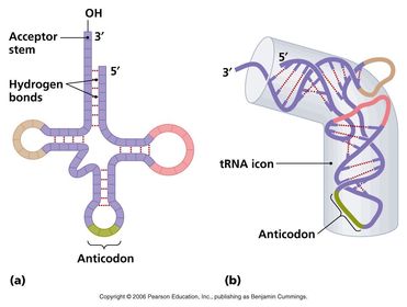 | Describe the structure of tRNA | tRNA is a single stranded chain folded into a clover leaf shape. One end extends further than the other. |