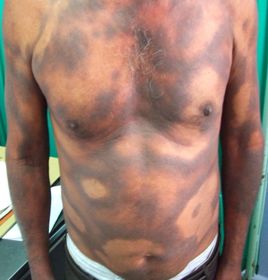 | A 34-year old woman from the Middle East presented with a 4-month history of a rash on her back. Physical exam revealed multiple hypopigmented, atrophic lesions with well-defined borders (image). The lesions were hairless and anesthetic and had developed over many months. Histopathological exam of a skin-biopsy specimen revealed granulomatous inflammation with numerous activated macrophages and lymphocytes. Acid-fast stain of the biopsy specimen is shown in image. Most likely diagnosis is what? | Tuberculoid leprosy |