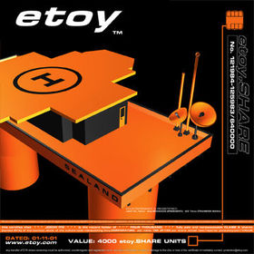 | -Purchase "Shares" online, receive art digitally (Like art collecting) -Digital distribution was a nightmare (slow internet) -During .com boom (everything had a website) | Shares Etoy 2000 |