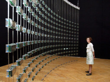 | -Tiny monitors that pull random information from the internet -Conceptually, it is relevant (can do it today with iPhones) -After this, realization that future utopia is not coming, brings darker themes. | Listening Post Hansen & Ruben 2002 |