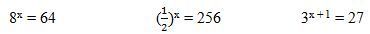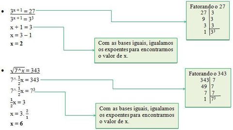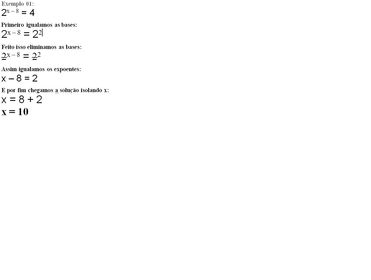 | Vamos resolver algumas equações exponenciais cujos dois membros podem ser reduzidos à mesma base. | |