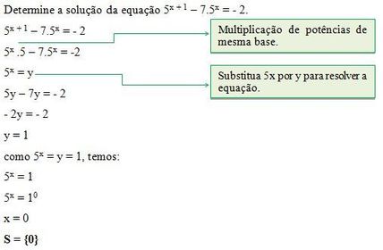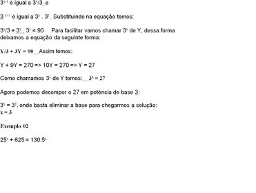 | Algumas equações exponenciais não poderão ser reduzidas a bases iguais, nesses casos, deveremos usar o método da substituição, exemplificado na sequência. | |