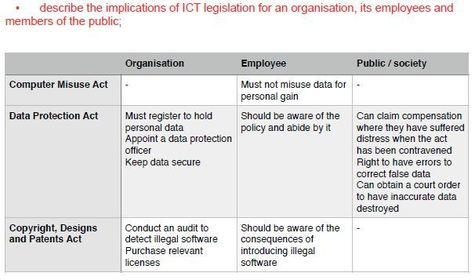 | Implications of ICT legislation for an organisation, its employees and members of the public | |