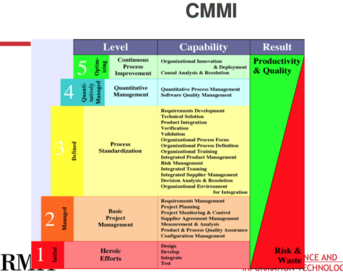 | Quality and metrics: CMMI - Capability maturity model is a set of rules and recommendations which should lead to improvements within and organisation - It puts best practices used in software development and service management - CMMI may also be thought as a framework to recognise and improve processes within an organisation. - Because of its abstraction it can be for all kinds of manufacturers - CMMI levels is a set of steps which each organisation can obtain in order to increase it value on the market. It requires a lot of involvement and effort to get to level 5 | CMMI - A maturity level is a well-defined state towards achieving a mature software process - Each maturity level provides a layer in the the foundation for continuous process improvement - In CMMI model with a staged representation, there are 5 maturity levels designated by the number 1 to 5 * initial * managed * defined * quantitatively managed * optimising |