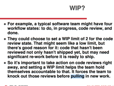 | - Having more than one person have the same skills avoids bottlenecks in the workflow - So teams hire basic best practices like code review and mentoring help to spread knowledge. Shared skills means members can take on heterogeneous work, which further optimises the cycle time - It also means that if there is a backup of work, the entire team can swarm on it to get the process flowing smoothly again. | - Multitasking is discourages as it kills efficiency - The more work items in progress at any given time, the more context switching, which hinders their path to completion - That's why a key idea of Kanban is to limit the work in progress (WIP) - Work in progress limits highlights bottlenecks and backups in the team's process due to lack of focus, lack of people or skill sets |
