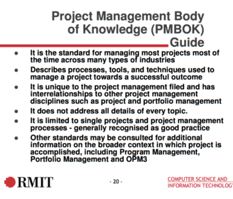 | PMI and the BOK: - The project management body of knowledge (PMBOK) is an inclusive term that describes the sum of knowledge within the profession of project management - The PMBOK included knowledge of widely used pratices, as well as advanced less used pratices - The guide to the Project management body of knowledge (PMBOK Guide) is a project management standard developed by the project management institute (PMI) - The PMBOK is widely accepted to be standard in project management | PM Body of knowledge: The nine knowledge areas are: 1. Porject integration management 2. Project scope management 3. Project time management 4. Project cost management 5. Project quality management 6. Project human resource management 7. Project communications management 8. Project risk management 9. Project procurement management |