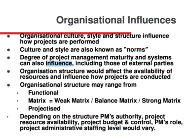 | Enterprise environemental factors: - Internal and external factors that surround and influence a project's success - These factors may enhance or constraint project management options, with positive or negative infuence on the outcome | They are considered as inputs to planning processes. They include but are not limited to : - Oraganisational cultutre, structure, and processes - Government and industru standards - Infrastructure - Existing human resources (skills, disciplin, knowledge, laws etc) - Personnel administration - Company work authorisation system - Market conditions, political climate - Stakeholders risk tolerance - Project management information systes (tools, software, etc) |