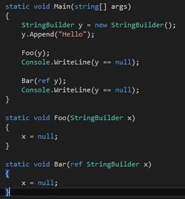 What would this output? False True The parameter to Foo is a value parameter and its value is the reference to memory where the value is held. Therefore setting it to null just removes that memory reference and is not reflected in the invocation. Note that changing the data in the object that is referred to will be seen by the invocation e.g. appending more data to the string in this instance. The parameter to Bar is passed by reference so changes are reflected in the invocation.